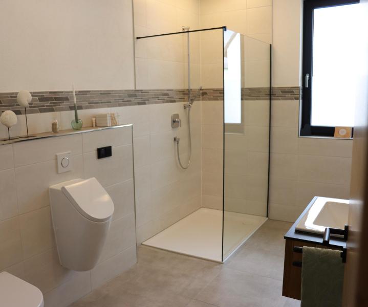 Im Haus erwarten Sie drei Schlafzimmer mit je einem Boxspringbett (3 Doppelbetten) sowie einem Babybett. Zudem stehen zwei moderne Bäder mit Regendusche, WC und Pissoir zur Verfügung. Das Hauptbad bietet zusätzlich eine Badewanne, einen Schminktisch sowie ein Ankleidezimmer mit direktem Zugang zu einem der Schlafzimmer. Das gesamte Haus ist mit Verdunkelungsmöglichkeiten ausgestattet.